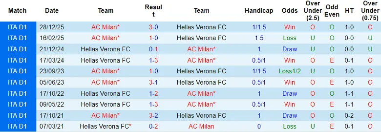 Hellas Verona đã thua kèo lẫn tỷ số tới 7/8 trận sân nhà gần nhất tại giải VĐQG Italia, trong đó có một trận thua khi được chấp 0,75 trái. Đội bóng này cũng không thắng trong cả 6 lần tiếp đón AC Milan thuộc Serie A kể từ tháng 9/2019. Rõ ràng, Hellas Verona không phải là một lựa chọn đáng tin cậy.