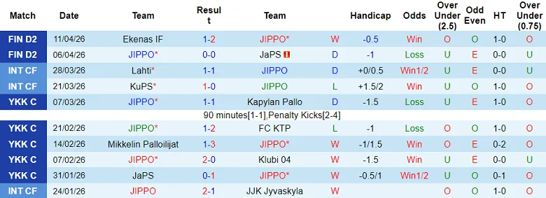 Cả hai đội đều đã trải qua hai vòng đấu đầu tiên của Ykkosliiga 2026. Kết quả cho thấy JIPPO vẫn duy trì được phong độ bất bại sau 2 trận, trong khi MP Mikkeli lại phải nhận thất bại ở cả hai trận. JIPPO hòa 0-0 trước JaPS (sân nhà) và sau đó giành chiến thắng 2-1 trước Ekenas (sân khách). MP Mikkeli lần lượt thua SJK Akatemia (0-1, sân khách) và FC KTP (0-1, sân khách).