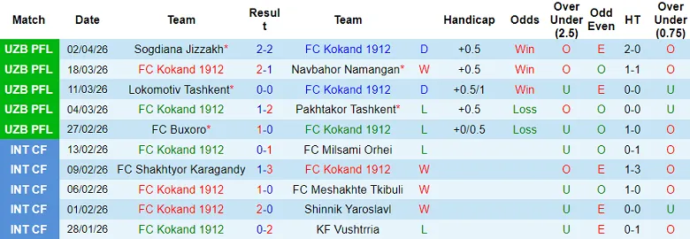 – Thống kê kết quả 10 trận gần đây của Kokand 1912.