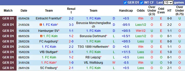Thống kê phong độ 10 trận gần nhất của Koln