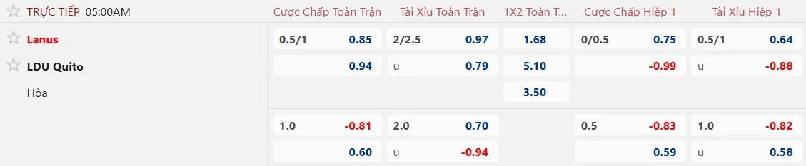 Sàn giao dịch châu Á đưa ra mức kèo Lanus chấp 3/4 trái, đây là mức cao nhất trong lịch sử đối đầu giữa hai đội, mặc dù đội chủ nhà gần đây không có phong độ tốt. Điều này cho thấy rằng các nhà đầu tư đang rất tin tưởng vào Lanus, đội đã toàn thắng kèo châu Á trong 2 lần gặp LDU Quito gần đây.
