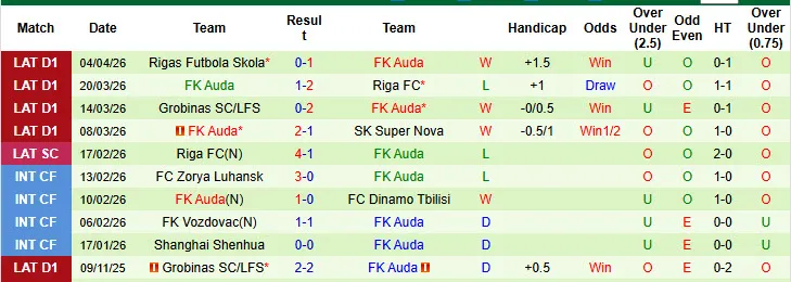 Liepaja chỉ có 1 lần thắng kèo trong 6 trận đấu gần đây trên thị trường châu Á. Trong khi đó, Auda đã bất bại kèo trong cả 5 trận đấu gần nhất mà họ tham gia.