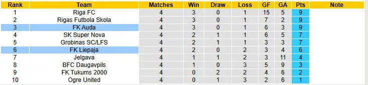 Thống kê phong độ, lịch sử đối đầu của Liepaja vs Auda