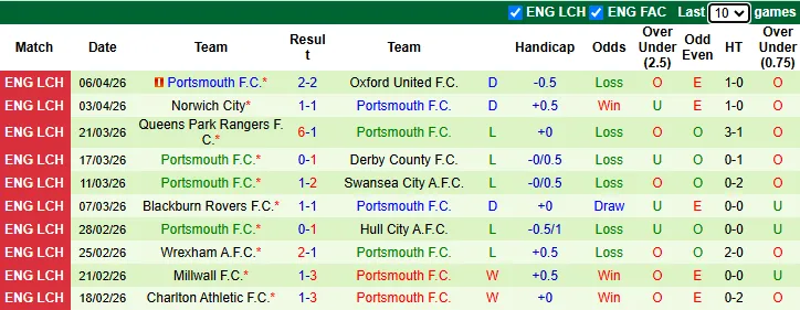 Thống kê phong độ 10 trận gần nhất của Portsmouth
