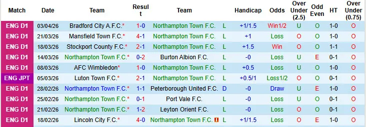 Thống kê phong độ 10 trận đấu gần nhất của Northampton