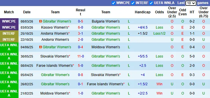 Thống kê phong độ 10 trận gần nhất của Nữ Gibraltar