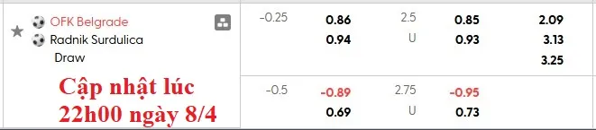 Kèo chấp cho OFK Beograd trong trận đấu này chỉ là 1/4, cho thấy đây là một mức cược không mấy khả quan cho đội chủ nhà. Từ đầu mùa giải, họ chỉ có 12 trận thắng kèo, kém 3 trận so với đối thủ. Khả năng Radnik Surdulica có điểm trong trận này là rất cao.