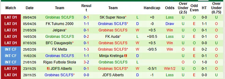Thống kê phong độ 10 trận đấu gần nhất của Grobinas