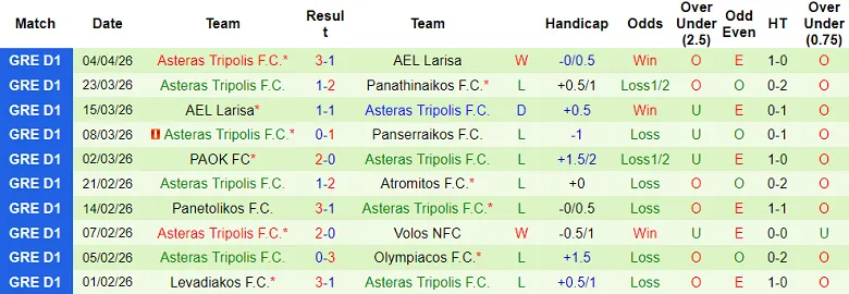 – Thống kê kết quả 10 trận gần nhất của Asteras Tripolis.