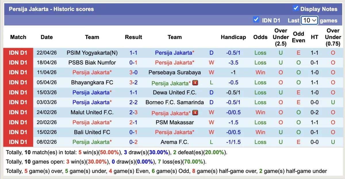 – Thống kê phong độ 10 trận đấu gần nhất của Persija Jakarta