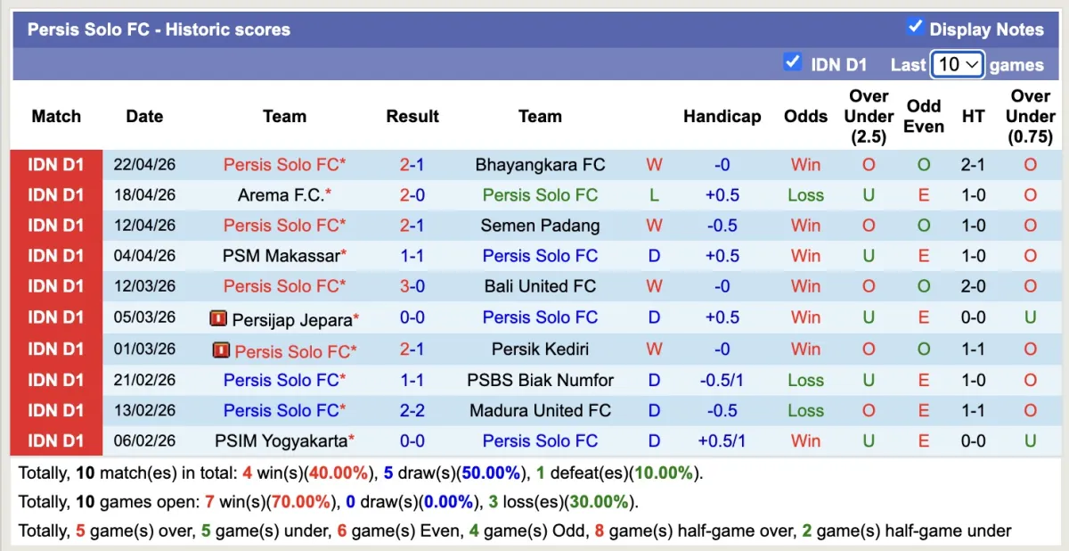 – Thống kê phong độ 10 trận đấu gần nhất của Persis Solo