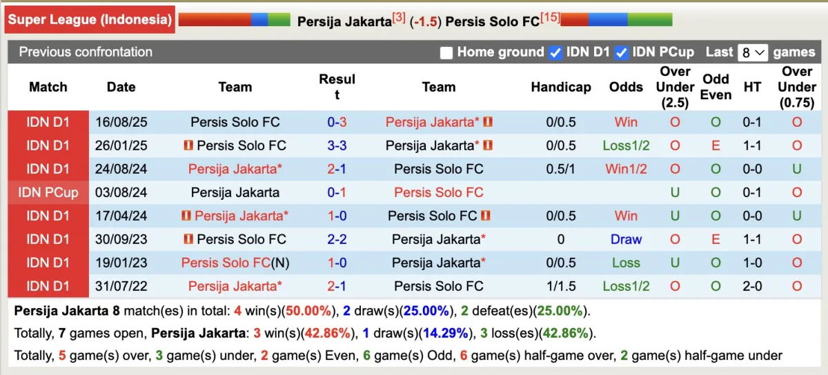 Không có gì ngạc nhiên khi Persija Jakarta được đánh giá cao hơn, nhưng mức chấp quá cao đang khiến người chơi nghi ngờ khi đặt cược, bởi 5/6 vòng đấu gần đây họ đều thua kèo. Ngược lại, 6/7 trận gần nhất, Persis Solo đều thắng kèo.