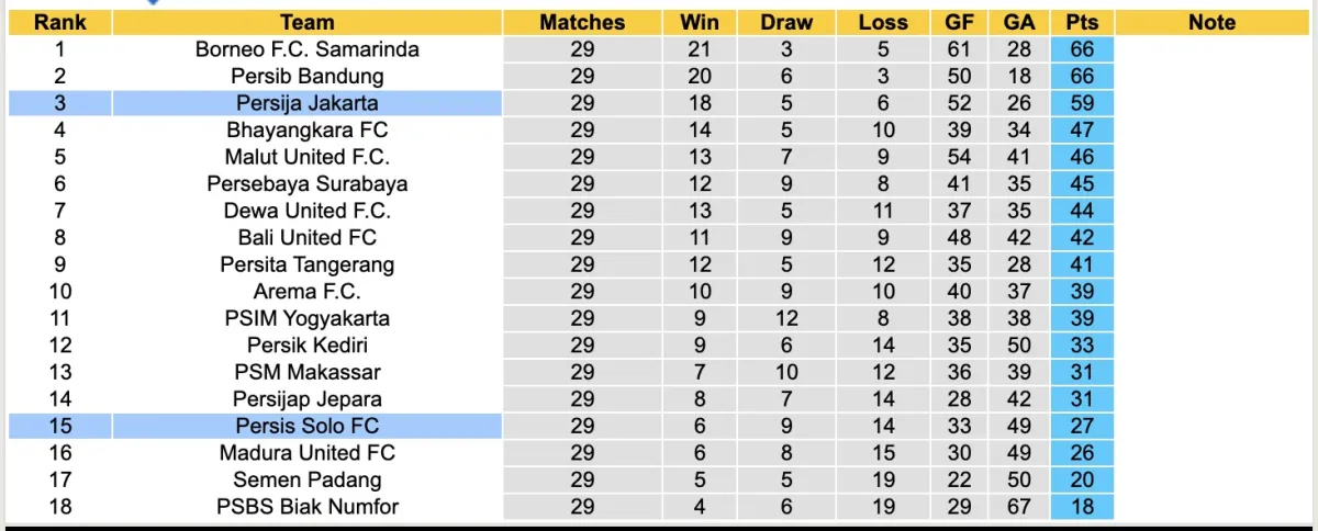Hiện tại, Persis Solo đang gặp khó khăn lớn ở mùa giải năm nay. Sau 29 trận đấu tại giải VĐQG Indonesia, họ chỉ có được 6 chiến thắng và chịu đến 14 thất bại. Hiện tại, họ chỉ còn cách nhóm xuống hạng 1 điểm.
