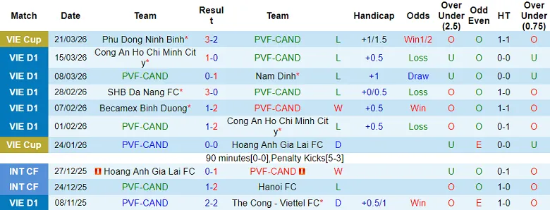 – Thống kê kết quả 10 trận gần đây của PVF-CAND.