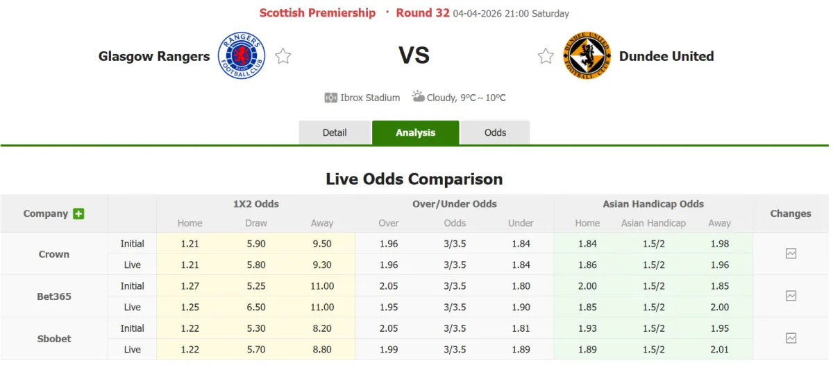 Phân tích và dự đoán kết quả trận đấu giữa Rangers và Dundee United diễn ra lúc 21h00 ngày 4/4 trong khuôn khổ giải VĐQG Scotland. Đội ngũ chuyên gia hàng đầu sẽ đưa ra những nhận định về tỷ lệ kèo châu Âu và châu Á cho cuộc chạm trán này.