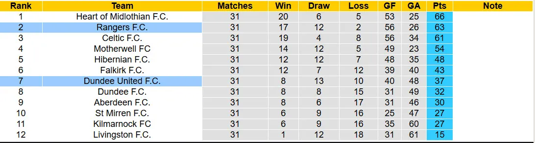 Quay trở lại với lượt trận cuối vòng phân loại, Rangers bước vào trận đấu với quyết tâm giành trọn 3 điểm để bám đuổi đối thủ, và nếu may mắn, họ hoàn toàn có thể vươn lên ngôi đầu nhờ vào hiệu số bàn thắng tốt hơn. Nhắc lại, Rangers là đội bóng chủ động khi thi đấu trên sân nhà và đang duy trì phong độ ấn tượng với chuỗi 10 trận bất bại gần đây (tính trong 90 phút chính thức). Trong khi đó, Dundee United không phải là lựa chọn an toàn khi thi đấu trên sân khách, với chỉ 1 chiến thắng, 1 trận hòa và 4 thất bại trong 6 trận xa nhà gần nhất.