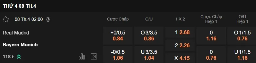 Trên sàn giao dịch châu Á, Bayern Munich được đánh giá chấp 1/4 trái, một tỷ lệ mà Hùm xám xứ Bavaria không có duyên khi đối đầu với Real Madrid, khi trong 2 trận gần nhất, họ có 1 thất bại và 1 trận hòa. Với Real Madrid, đội chủ nhà bước vào trận đấu này với thành tích thắng kèo châu Á 5/6 trận gần đây.
