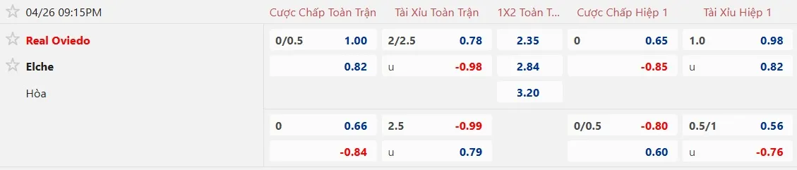 Tại sàn giao dịch châu Á, Real Oviedo được nhà cái xếp cửa trên với mức chấp 1/4 trái, tỷ lệ mà ở trận đấu gần nhất giữa hai đội, họ đã giành chiến thắng nghẹt thở khi còn thi đấu tại giải hạng 2. Phong độ gần đây của Real Oviedo cũng đang rất thuyết phục với việc thắng kèo châu Á 5/6 trận gần nhất. Trong khi đó, Elche lại gặp khó khăn khi thi đấu trên sân khách, khi họ đã thua kèo 5/6 trận vừa qua.