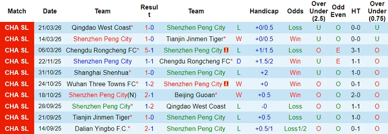 – Kết quả 10 trận gần nhất của Shenzhen Peng City