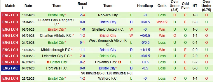 Thống kê phong độ 10 trận đấu gần nhất của Bristol