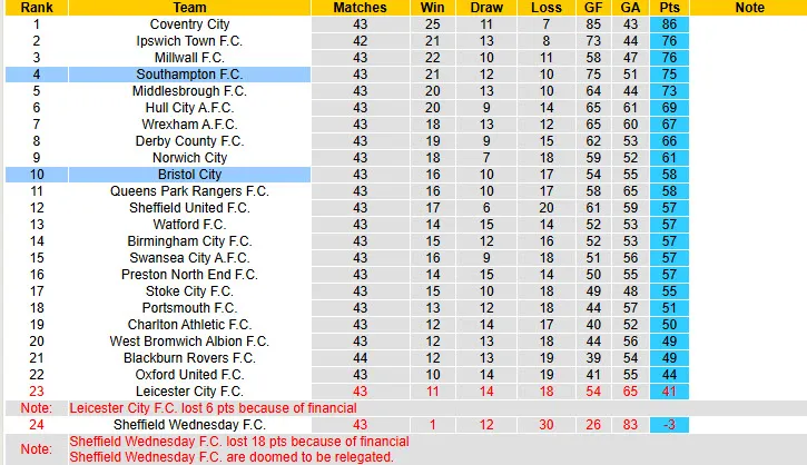 Ở lượt trận diễn ra vào cuối tuần trước, Bristol đã phải nhận thất bại nặng nề 0-4 trước Norwich ngay trên sân nhà. Với kết quả này, mùa giải hạng Nhất Anh 2025/26 đã sớm kết thúc với Bristol khi họ không còn cơ hội lọt vào top 6 – nhóm tham dự play off thăng hạng. Hiện tại, Bristol chỉ có 58 điểm và đang kém nhóm dự play off tới 11 điểm, trong khi giải hạng Nhất chỉ còn lại 3 lượt trận. Đêm nay, đội bóng dưới sự dẫn dắt của HLV Roy Hodgson sẽ có chuyến làm khách tại sân St Marys của Southampton, và hầu hết các chuyên gia đều dự đoán rằng Bristol sẽ khó tránh khỏi thất bại. Cần lưu ý rằng Bristol đang không còn động lực thi đấu và phong độ của họ cũng rất kém khi không thắng đến 8 trong 10 trận đấu gần đây.