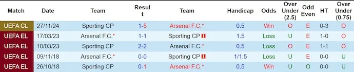 Trong lịch sử đối đầu giữa hai đội, kết quả khá cân bằng với 5 lần gặp nhau gần đây. Arsenal có 2 chiến thắng, Sporting có 1 lần thắng và 2 trận kết thúc với tỷ số hòa. Tuy nhiên, trên sân José Alvalade, Sporting vẫn chưa từng đánh bại Arsenal trong 3 lần tiếp đón trước đó, điều này khiến trận đấu lần này càng trở nên khó lường.