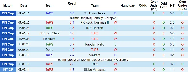 Trong số 8 trận gần đây thuộc Suomen Cup của TuPS, có tới 7 trận ghi từ 3 bàn thắng trở lên. Kịch bản quen thuộc này nhiều khả năng sẽ lặp lại khi TuPS và JaPS gặp nhau tại vòng 3 mùa 2026.