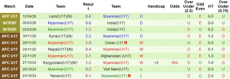 – Kết quả 10 trận gần đây của U17 Myanmar