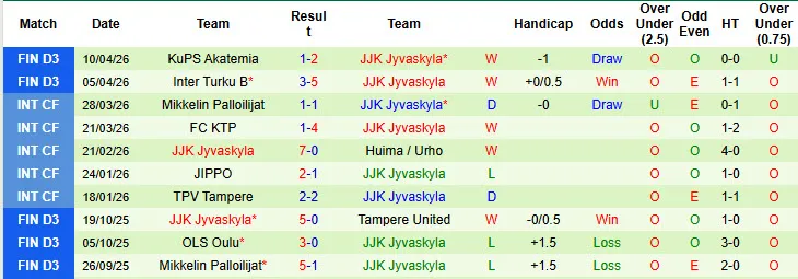 Thống kê phong độ 10 trận đấu gần nhất của JJK Jyvaskyla