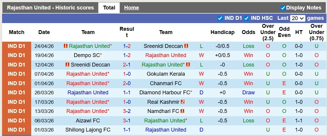 Thống kê phong độ 10 trận đấu gần nhất của Rajasthan United