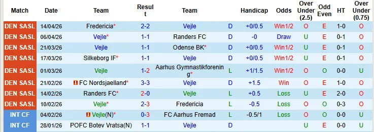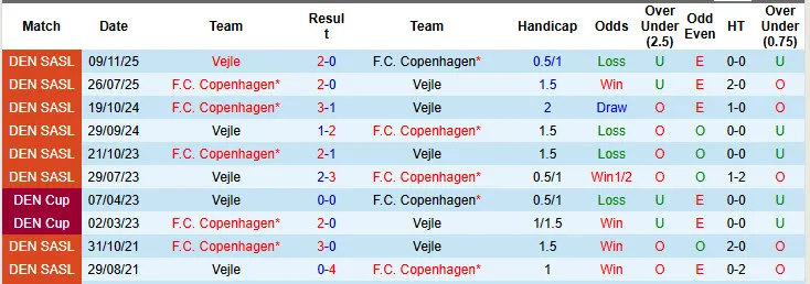 Trong 2 lần đối đầu gần nhất giữa Vejle và Copenhagen, mỗi trận chỉ có 2 bàn thắng được ghi. 3 trong số 4 trận gần đây của Vejle cũng chỉ có 2 bàn/trận và đều kết thúc với tỷ số hòa 1-1.