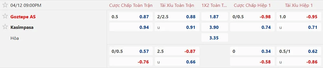 Trên sàn giao dịch châu Á, Goztepe được xếp cửa trên với mức chấp 1/2 trái, tỷ lệ mà đội bóng này thường có kết quả khả quan khi tiếp đón Kasimpasa tại sân nhà, với 2 trận thắng gần nhất. Cần lưu ý, trong 2 trận gần đây mà Goztepe chấp 1/2 trái, họ cũng đã giành chiến thắng.