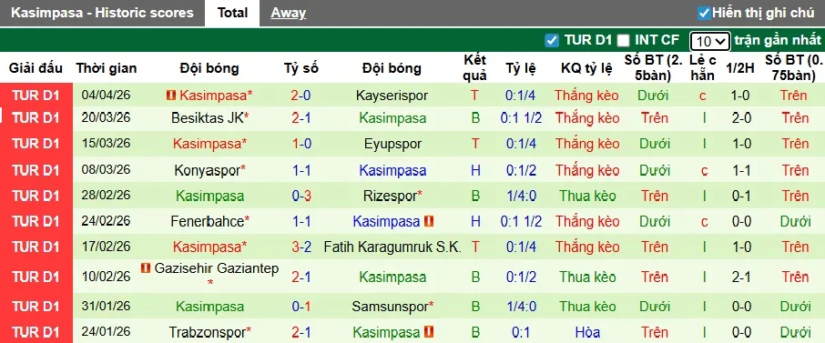 Thống kê phong độ 10 trận đấu gần nhất của Kasimpasa.