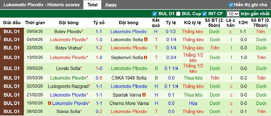 Thống kê phong độ 10 trận đấu gần nhất của Lokomotiv Plovdiv