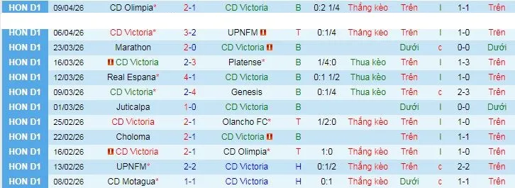 Thống kê phong độ 10 trận đấu gần nhất của CD Victoria.