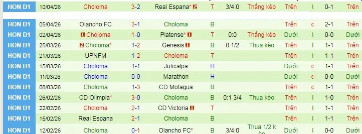 Thống kê phong độ 10 trận đấu gần nhất của Choloma.