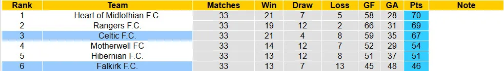 Về lý thuyết, khoảng cách này không quá lớn, nhưng với việc vòng bảng tranh vô địch chỉ có 5 lượt trận, Celtic cần phải nỗ lực gấp đôi mới có thể bảo vệ ngôi vương. Đêm nay, họ sẽ có trận mở màn vòng bảng tranh vô địch với Falkirk, và đây là cơ hội tốt để giành trọn 3 điểm. Cần nhắc lại rằng, Celtic đang có tâm lý tích cực sau khi vừa giành chiến thắng trước Saint Mirren ở trận bán kết cúp FA Scotland cách đây không lâu. Tại giải VĐQG Scotland, Celtic đã thắng cả 2 trận gần đây và thể hiện quyết tâm bảo vệ ngai vàng. Ngược lại, Falkirk đang đứng cuối bảng tranh vô địch với phong độ kém cỏi. Cần biết rằng, Falkirk chỉ có 1 chiến thắng trong 5 trận đấu gần nhất trên mọi đấu trường. Hiện tại, Falkirk không còn nhiều cơ hội cạnh tranh vé dự cúp châu Âu, điều này khiến người hâm mộ hoài nghi về tinh thần thi đấu của họ.