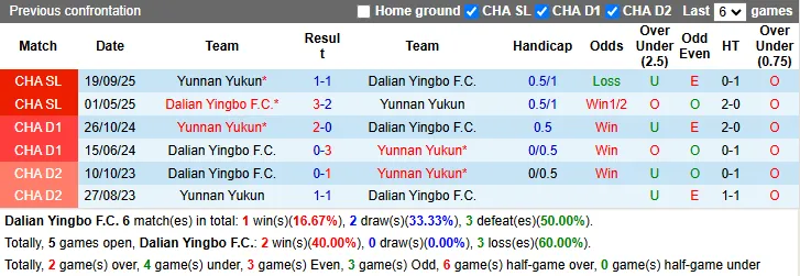 Thống kê phong độ, lịch sử đối đầu Dalian Yingbo vs Yunnan Yukun