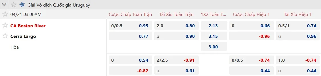 Tại sàn giao dịch châu Á, mức kèo được ghi nhận là 0:0, một tỷ lệ mà Cerro Largo có thành tích khá tốt, khi trong 4 lần đối đầu gần nhất họ đã giành 2 chiến thắng và 2 trận hòa. Với việc thắng kèo châu Á trong 4/6 trận đấu vừa qua, Cerro Largo đang có cơ hội lớn để nâng cao thành tích trước Boston River, đội bóng đã thua kèo trong trận sân nhà gần đây có tỷ lệ tương tự.