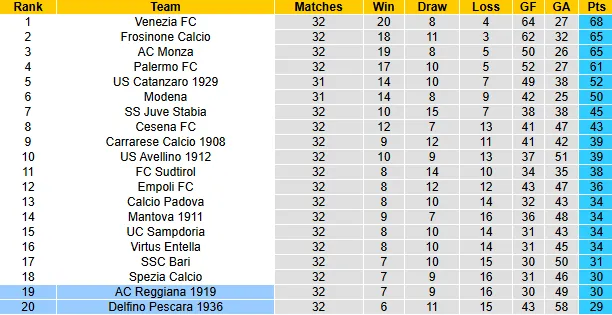 Reggiana hiện đang trải qua giai đoạn khó khăn nhất từ đầu mùa giải. Thống kê cho thấy một thực trạng đáng lo ngại: Reggiana đã không có được chiến thắng nào trong 5 trận gần đây, trong đó có đến 4 lần thất bại. Hàng công của họ đang gặp khó khăn nghiêm trọng khi không thể ghi bàn trong 4/5 trận đấu đó. Mặc dù sở hữu những cầu thủ như Manolo Portanova (6 bàn) hay tiền vệ Manuel Marras, nhưng lối chơi của Reggiana đang trở nên dễ bị đối thủ bắt bài.