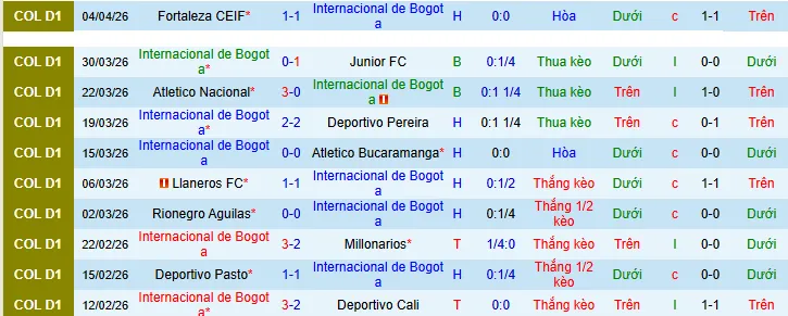 + Inter Bogota có thành tích không tốt với 3 thất bại và 2 trận hòa trong 5 trận gần nhất theo kèo châu Á.