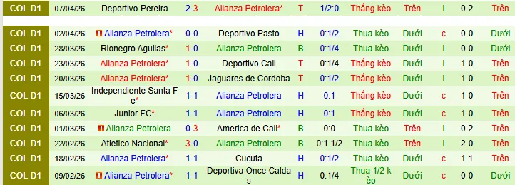 + Alianza Petrolera có 3 thắng, 3 thua và 4 hòa trong 10 trận gần nhất ở giải VĐQG.