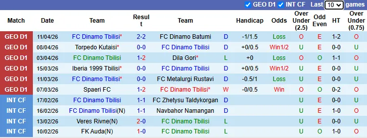 Thống kê phong độ 10 trận gần nhất của Dinamo Tbilisi