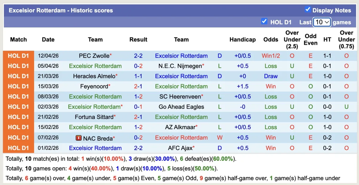 [P19] -Thống kê phong độ 10 trận đấu gần nhất của Excelsior Rotterdam.
