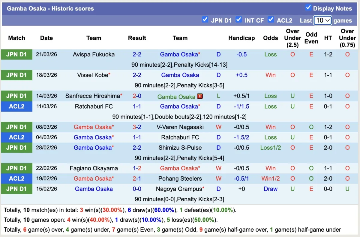 – Thống kê phong độ 10 trận gần nhất của Gamba Osaka