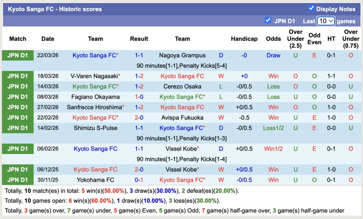 – Thống kê phong độ 10 trận gần nhất của Kyoto Sanga