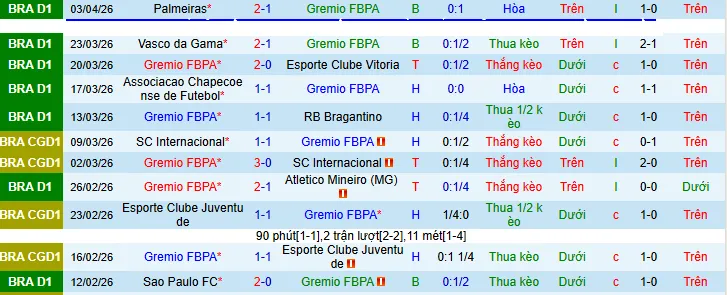+ Gremio thắng 4, hòa 2 và thua 2 trong 10 trận gần đây theo kèo châu Á.