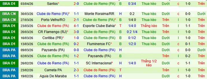 + Remo thua cả 4 trận mới nhất khi thi đấu trên sân khách theo kèo châu Á.