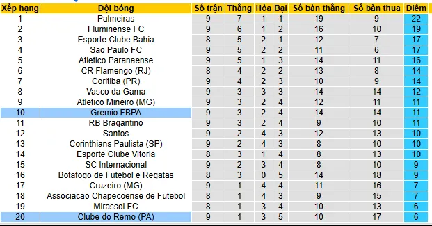 + Gremio thắng 4, thua 4 và hòa 2 trong 10 trận gần đây ở giải VĐQG.