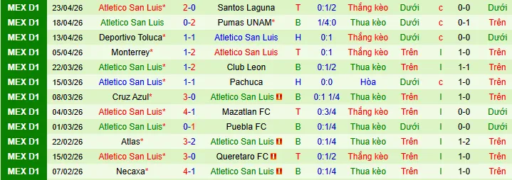 + San Luis thắng 3, thua 5 và hòa 2 trong 10 trận gần nhất ở giải VĐQG.